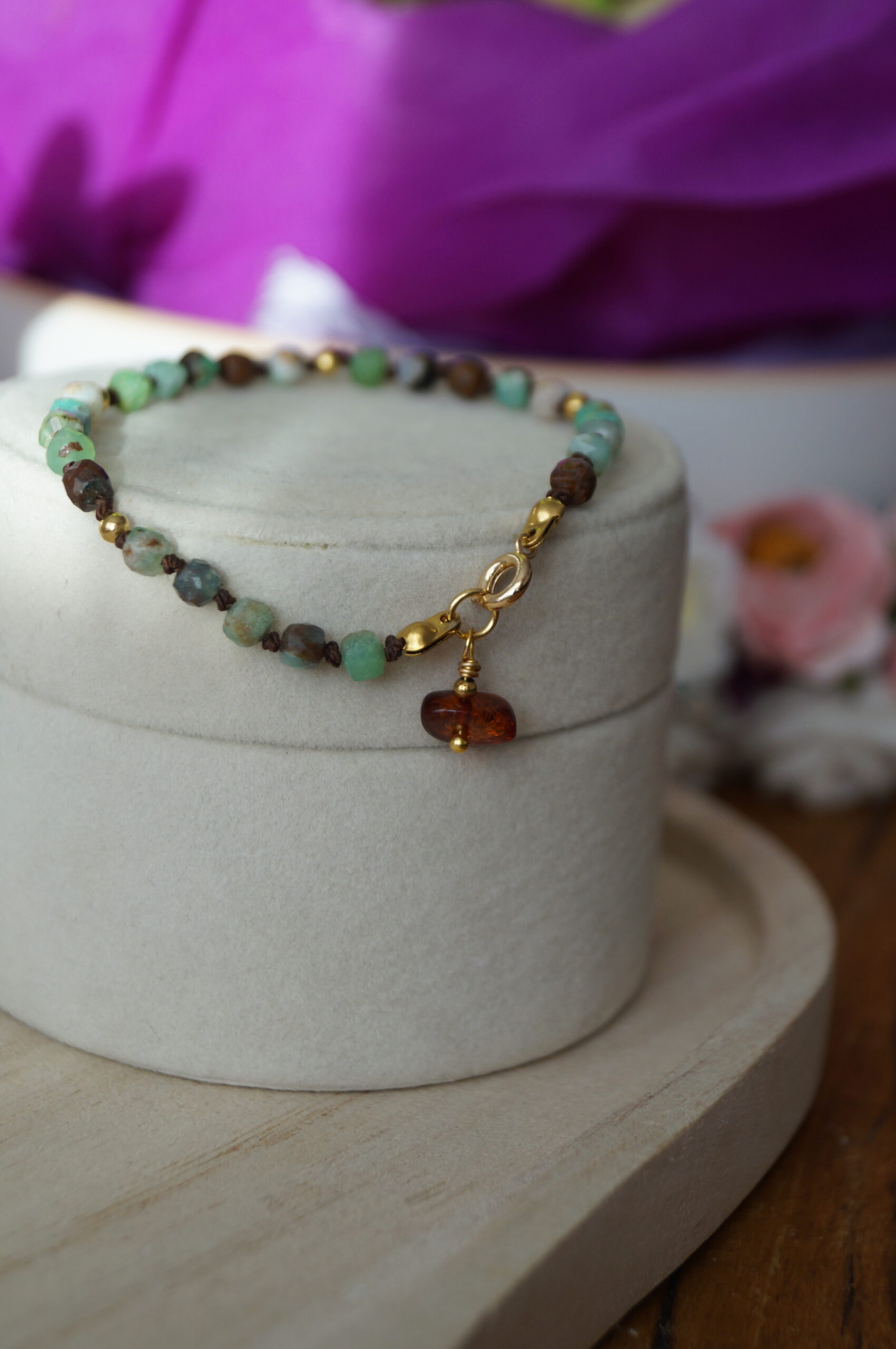 Delikatna, a jednocześnie wyrazista bransoletka z chryzokoli i bursztynu, stworzona z myślą o miłośniczkach naturalnej biżuterii. Każdy kamień został starannie dobrany, tworząc harmonijną kompozycję barw inspirowaną naturą – od odcieni turkusu i zieleni po ciepłe, miodowe refleksy bursztynu.