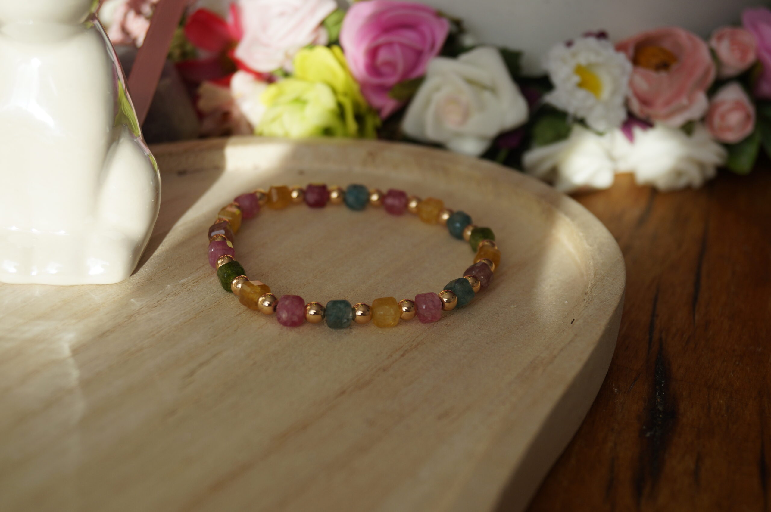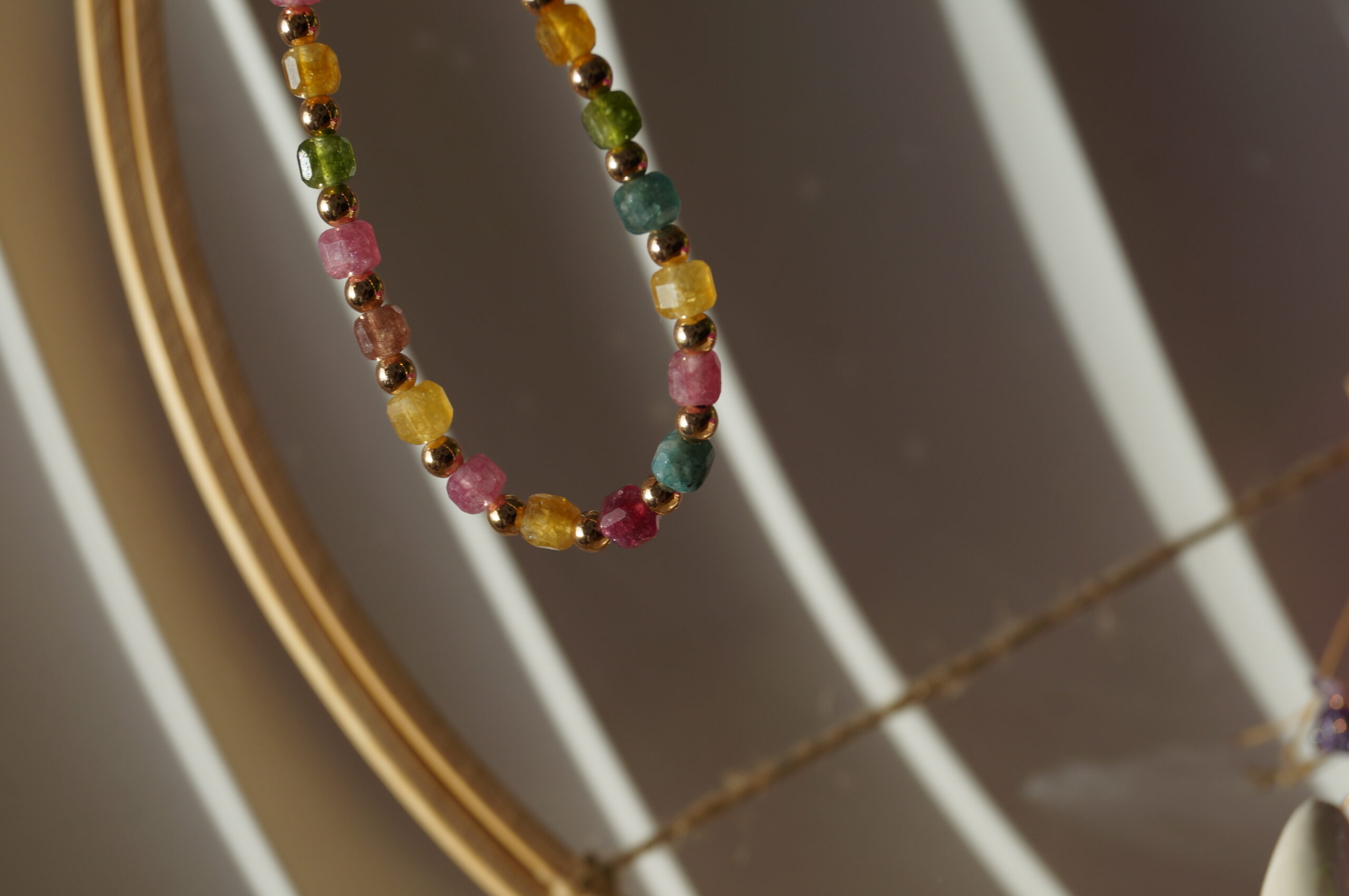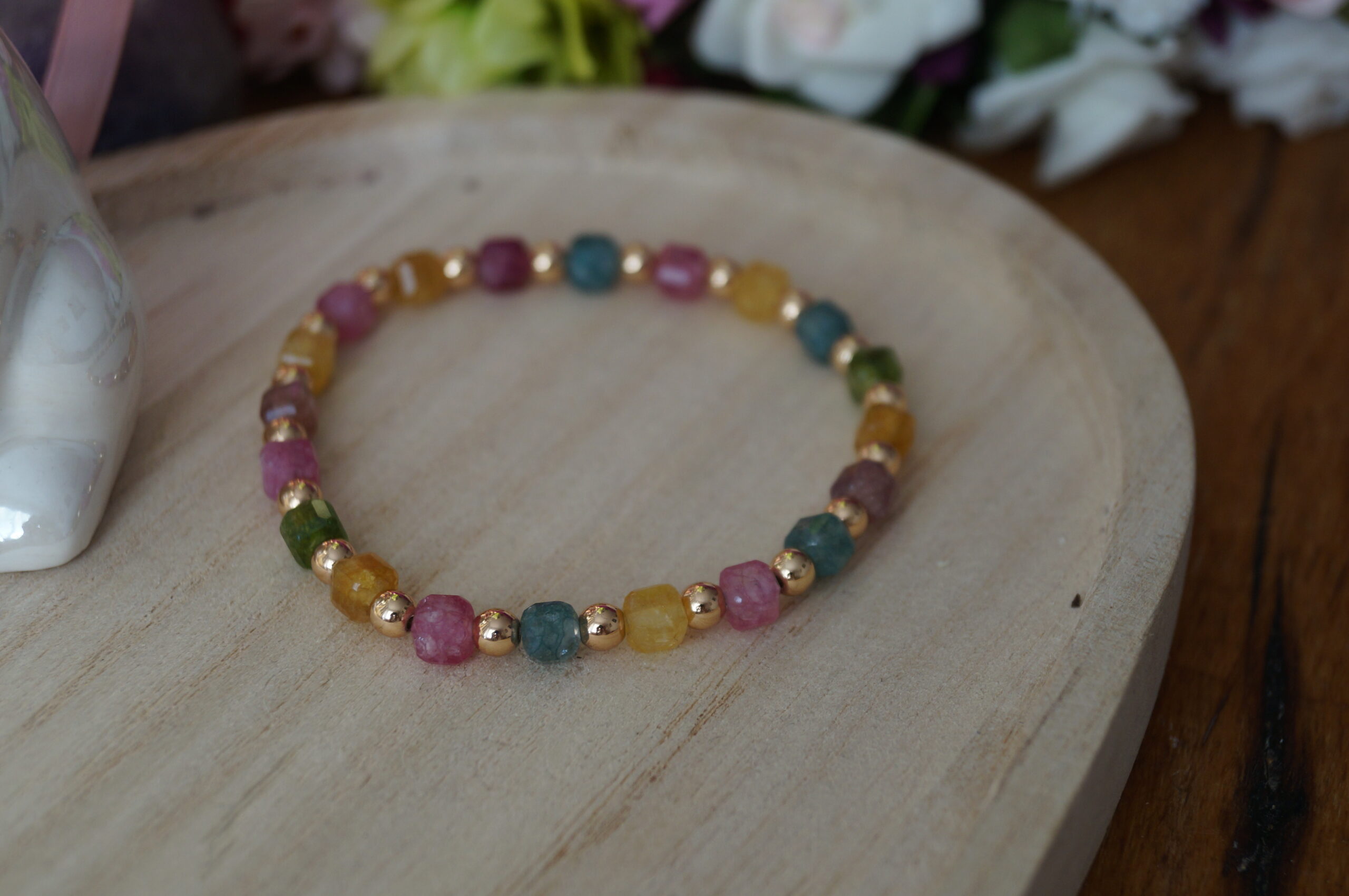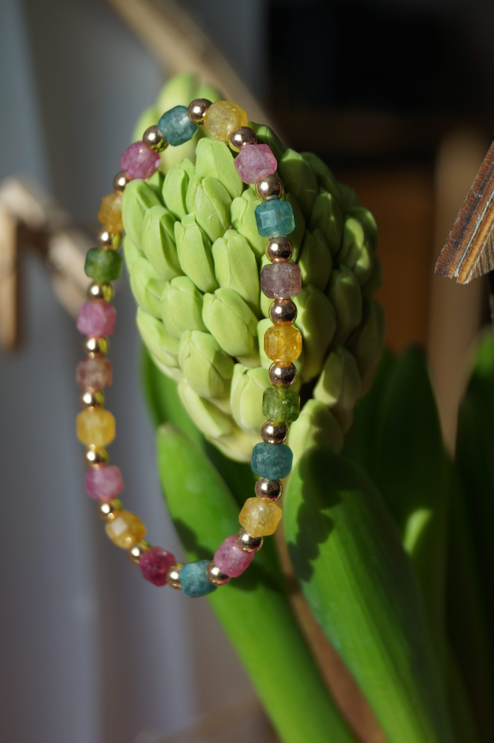 Bransoletka „Rainbow” z turmalinu i hematytu to wyjątkowy dodatek wykonany z naturalnych kamieni – kostek turmalinu o wielkości 4 mm w pięknych, różnorodnych barwach. Każdy kamień jest unikalny, dzięki czemu bransoletka ma swój niepowtarzalny charakter. Całość uzupełniają złocone kuleczki z hematytu, które dodają całości delikatnego blasku i elegancji.