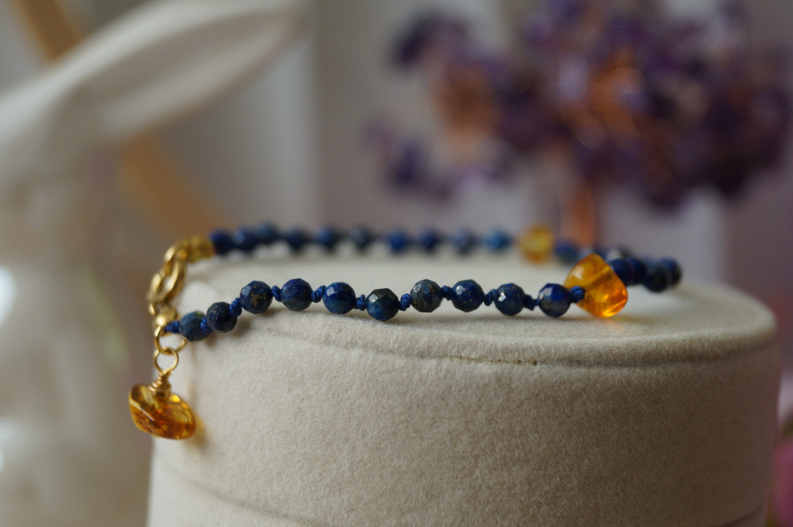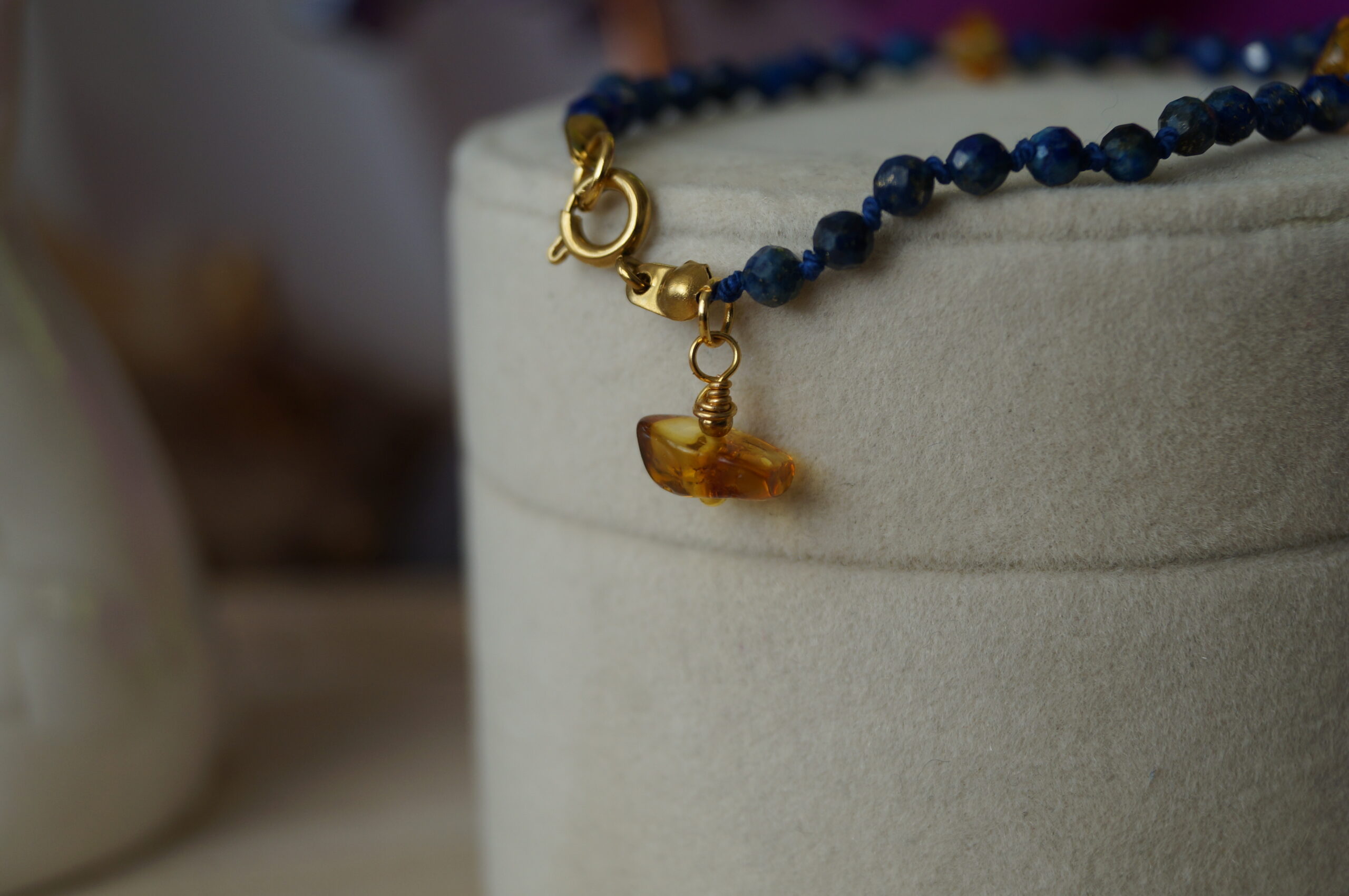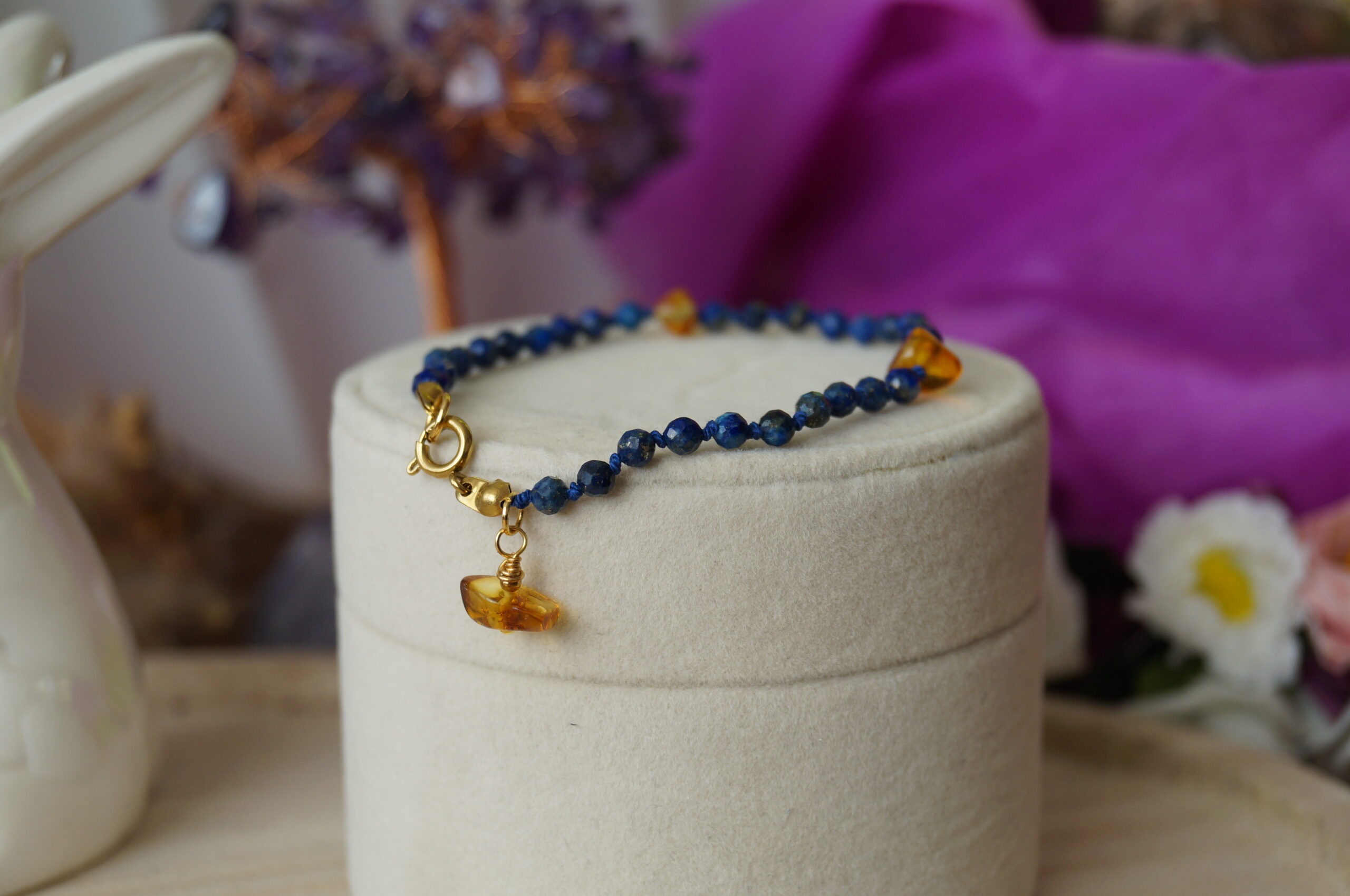 Centralnym elementem są fasetowane koraliki z lapis lazuli – kamienia znanego z intensywnej, głębokiej barwy oraz symboliki spokoju i harmonii. Całość dopełniają naturalne akcenty z bursztynu, które wprowadzają ciepły, złocisty blask i nawiązują do morskiej tajemnicy, od której bransoletka wzięła swoją nazwę.